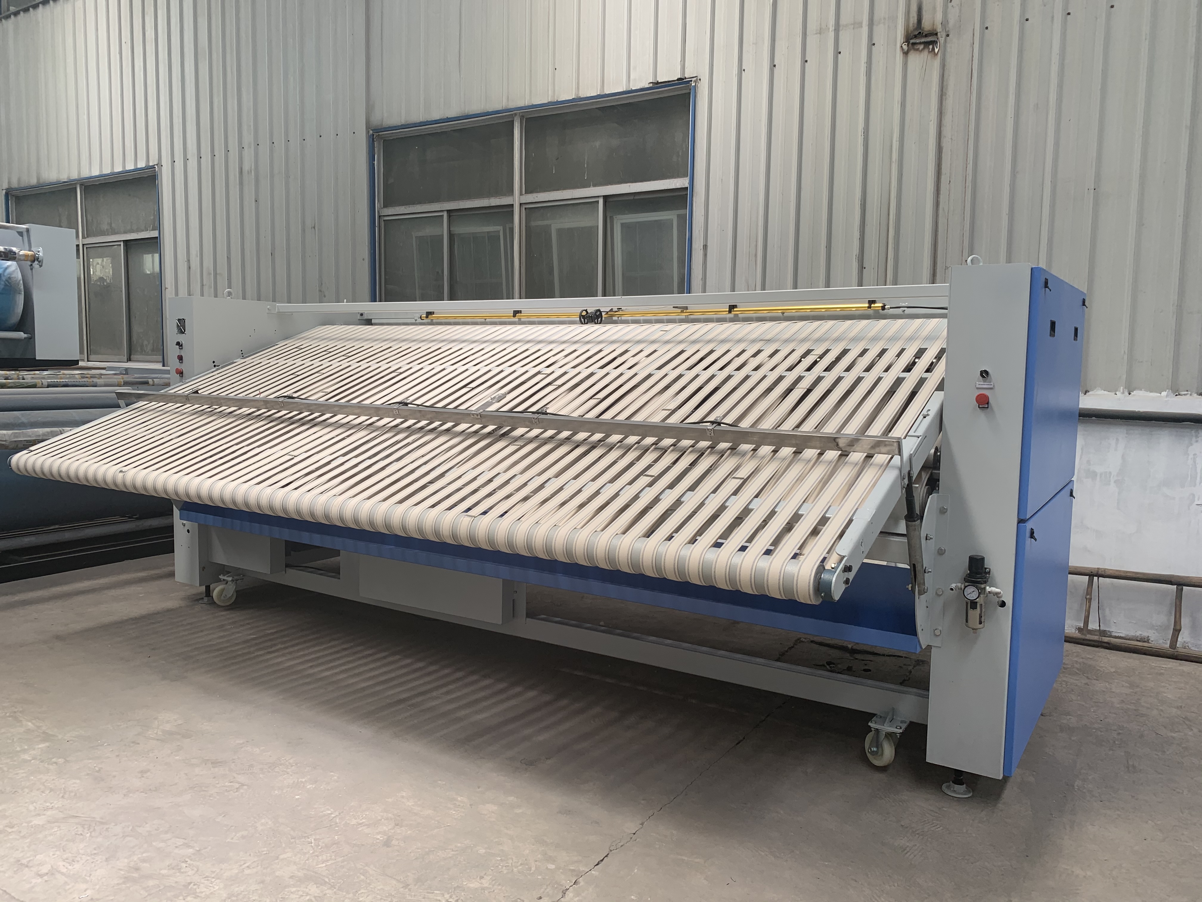 折疊機(jī)一款洗滌設(shè)備輔助機(jī)械產(chǎn)品,控制布料傳送系統(tǒng)的速度和定位,測定布料長度并計算折疊長度,通過氣流的噴射和折刀來完成水平折疊和交叉折疊。